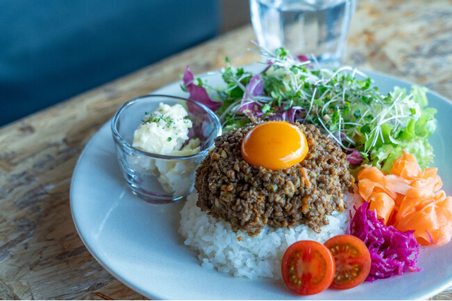 カレーとの相性抜群な副菜もたっぷり添え、味の変化も楽しむプレートスタイルでのご提供。