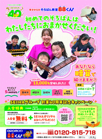 セイハネットワーク株式会社が展開する「そろばん教室88くん」では、創業40周年を記念した「春のキャンペーン第二弾」を、2025年4月1日(火)から実施中です。