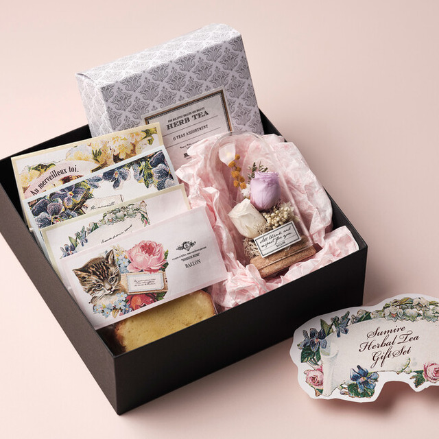 (セット内容)ハンド用美容液クリーム(ダマスクローズ)、限定フラワーアレンジメント、ハーブティー(アフロディテズスマイル・ディープリラクゼーション・フリーダムオブマインド・ハピネスオブスリープ)、すみれ工房パウンドケーキ:プレーン、ショコラ、フルーツ、紅茶4種各1個