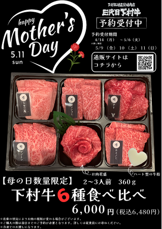 株式会社下村畜産食肉(本社:愛知県大府市、代表取締役社長:下村知士)は、 5月11日(日)「母の日」に合わせ、当社の運営する下村牧場直営焼肉店 三代目下村牛に於いて、黒毛和牛の「下村牛」をちょっとおトクに、ちょっと贅沢にお楽しみ頂きたいという想いを込めて、「下村牛6種食べ比べ_母の日ギフト」のご予約を4月14日(月)から開始いたします。
