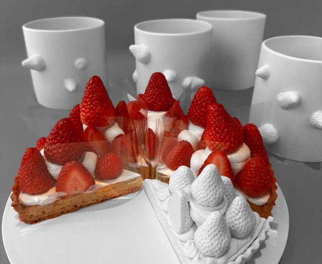 え!と思わずびっくりしてしまう、アートの世界観をカフェに取り入れました。前田あかね氏がこの作品に掲げたテーマ「器とそこに盛られるものの関係性」と、Cafe Polumでいちばん人気のいちごタルトが見事にコラボレーションした作品です。本物そっくりのいちごタルトのアートは、シンプルで洗練されたデザインで、まわりの本物のいちごタルトの美味しさと美しさを一層引き立てます。