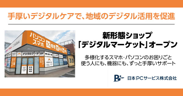 デジタル機器の設定・トラブル解決を行う日本PCサービス株式会社(本社:大阪府吹田市、代表取締役社長:家喜 信行、証券コード:6025、以下「当社」)は、地域のデジタル活用を促進するべく、2025年4月18日(金)に郊外型の新形態ショップ「デジタルマーケット」をオープンします。新店舗では修理・トラブル解決だけでなく、パソコン・スマホの販売・買取・相談、スマホの料金見直しなど、デジタルライフサイクルのすべてのポイントで手厚いサポートを提供し、誰でも安心してデジタル活用できる環境を整え、これからの社会で必要とされる存在を目指します。