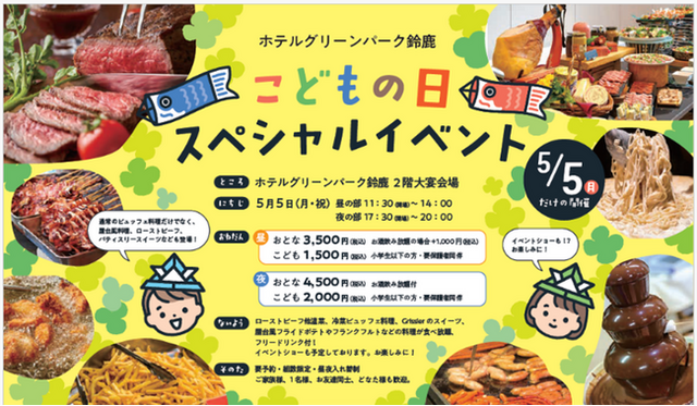 株式会社グリーンズ(本社:三重県四日市市、代表取締役社長:村木雄哉、証券コード:6547)は、2025年5月5日(月・祝)、ホテルグリーンパーク鈴鹿(所在地:三重県鈴鹿市白子)にて、ご家族で楽しめる「こどもの日特別ビュッフェ」を開催いたします。