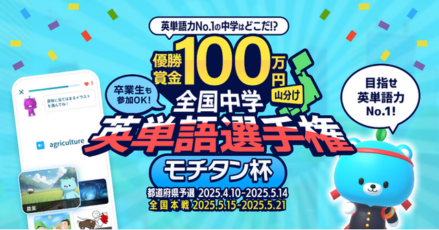 英単語アプリ「モチタン」を運営する株式会社Astran(本社:東京都中央区)は、全国の中学生や卒業生を対象とした英単語選手権「モチタン杯2025」を2025年4月10日(木)より開始いたします。優勝賞金は100万円。参加方法は、英単語アプリ「モチタン」をインストールして、在籍中学または母校を登録するだけです。