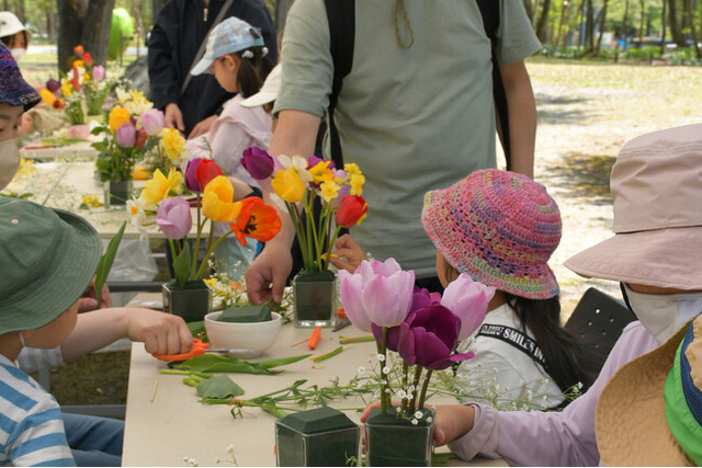 花畑のお花を使ったフラワーアレンジメント体験。「れき原の花畑」に咲く10品種のチューリップから好みのお花を選んで摘み取り、器にセットした吸水スポンジに生けていきます。アレンジメントの日持ちは5日から1週間程度。公園のチューリップをご自宅でもお楽しみいただけます。