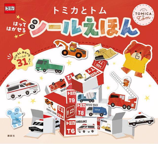 『トミカとトム はって はがせる シールえほん』は3見開きのシールブックで、トミカの箱からぱかっとトミカが登場。最後は箱にお片付けします。31枚のはってはがせるシールには、救急車、消防車、パトカー、清掃車など人気の車が大集合。ぬいぐるみのトムが運転する車もシールになっています。