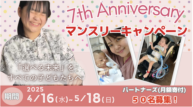医療的ケア児とその家族を応援しているNPO法人アンリーシュ(東京都中央区、代表理事:金澤 裕香)は、設立7周年を迎えるにあたり、キャンペーンとして4月16日から5月18日までパートナーズ(月額寄付者)50名を募集するキャンペーンを開催します。