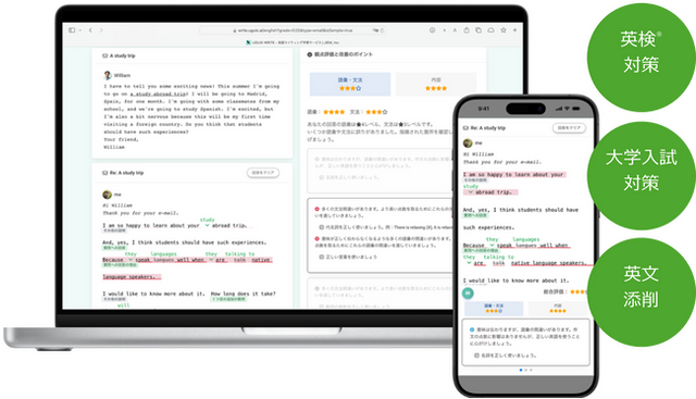 UGUIS.AIは、AIを活用した英語ライティング学習サービスです。AIが自動生成技術を活用して英語のライティング問題を自動で作成し、その問題に対して学習者が解答した英文をAIが即時に採点・添削します。利用期間中、学習者はAIの「内容の評価」「誤りの指摘」「改善の提案」といったフィードバックを何度でも受けることができます。また、AIチャット「UGUIS先生」に別解や解き方のコツなどを自由に質問できる機能もあり、学習者の「わからない」をすぐに解決できるようアシストします。さらに、学習者の利用状況や学習履歴などが一目で確認できる管理機能もあり、英語ライティングの学習に必要な「量と質」を提供するとともに、学習者自身の探究的な学びの高度化、及び、教員の教材作成、採点・添削・コメント記入等の業務効率化や省力化を支援します。