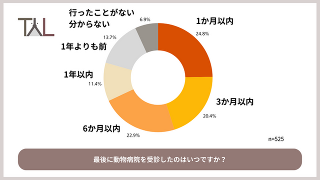 犬猫の飼い主525名に対し「最後に動物病院を受診したのはいつですか?」と質問したところ、「1か月以内」(24.8%)、「3か月以内」(20.4%)、「6か月以内」(22.9%)と定期的に通院する飼い主が6割を超えました。一方で、定期的に動物病院に足を運ぶことのない飼い主も半数近く見られ、ペットにも医療格差が広がっている実態が見えてきました。