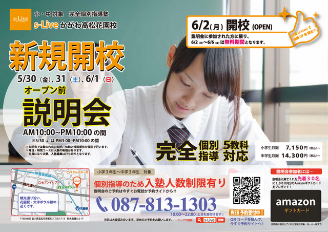 6月2日にオープンする 個別指導塾s-Liveかがわ高松花園校 TEL:087-813-1303
