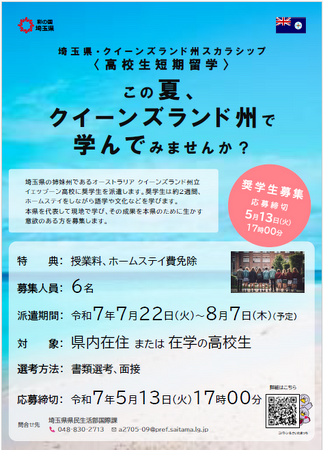 埼玉県・クイーンズランド州スカラシップ<高校生短期留学>