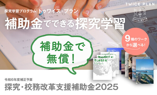 この補助金を活用いただくことで、学校等の教育機関で探究学習プログラム『TWICE PLAN』のワークを無償で実施いただけます。