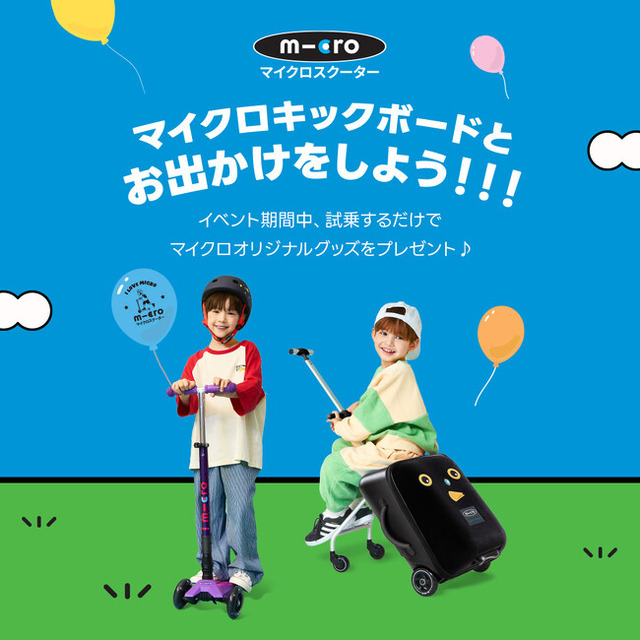 全世界80ヵ国の子供たちに大人気のキックボードブランドマイクロスクータージャパン株式会社(東京都港区)は、アクアシティお台場3階の日本最大級のマイクロスクーター体験型の直営店と横浜MARKISみなとみらい店で4月19日から5月11日まで【マイクロキックボードとお出かけ】というテーマで試乗イベントを実施いたします。