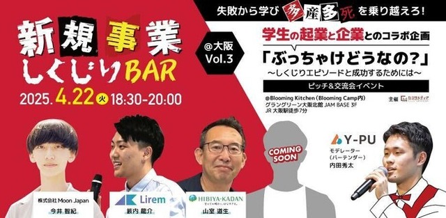 株式会社カスタメディア(本店:大阪府大阪市、代表取締役:宮崎耕史、以下 当社)が4月22日(火)18:30から大阪市にあるBlooming Camp(運営:さくらインターネット株式会社)にて『新規事業しくじりBAR Vol.3 ぶっちゃけどうなの?学生の起業と企業とのコラボ企画 ~しくじりエピソードと成功するためには~』を開催します。