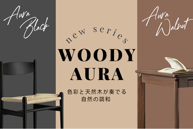 Woody Auraシリーズは、自然の恵みを最大限に生かした天然木家具の新シリーズです。厳選された天然木を使用し、職人の手でひとつひとつ丁寧に仕上げられています。
