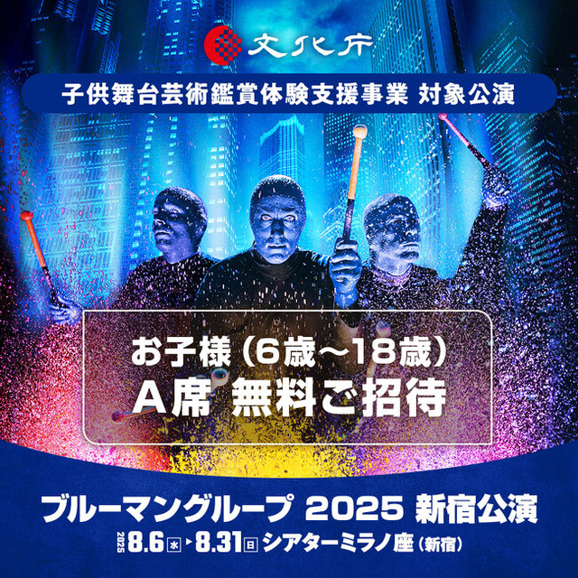 2025年8月に上演される『ブルーマングループ2025新宿公演』が、文化庁の「子供文化芸術活動支援事業」の対象公演として採択されました。6才から18歳のお子様を無料でご招待いたします。