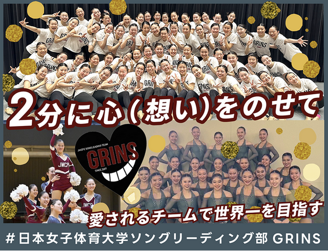 日本女子体育大学ソングリーディング部GRINSは、2007年にサークルとして発足し、今年で創部18周年を迎えました。創部当時は7名でのスタートでしたが、現在では70名を超える大所帯のチームへと発展して参りました。