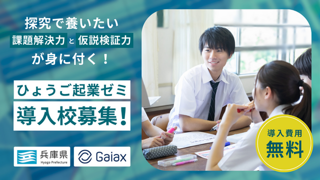 アントレプレナーシップ教育(※)プログラム「起業ゼミ」を提供する株式会社ガイアックス(本社:東京都千代田区、代表執行役社長:上田 祐司、証券コード:3775、以下「ガイアックス」)は、兵庫県の「若年層向けアントレプレナーシップ教育プログラム導入事業」業務を受託し、「起業」をテーマにした探究プログラム「ひょうご起業ゼミ」(以下「本プログラム」)を、兵庫県内の中学・高校に無償で提供することが決定しました。