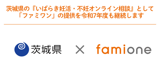 「子どもを願うすべての人によりそい 幸せな人生を歩める社会をつくる」をビジョンに掲げ、法人の従業員向け福利厚生や自治体の住民向け支援を行うヘルスケアサポートサービス「ファミワン」 https://famione.com/benefit/などを展開する株式会社ファミワン(本社:東京都渋谷区、代表取締役:石川勇介)は、茨城県(県知事:大井川 和彦、以下茨城県)からの委託を受け、茨城県妊活・不妊等サポート体制強化事業(いばらき妊活・不妊オンライン相談)において、令和7年度のサービスの提供継続が決定いたしました。