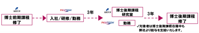 本プログラムでは、滋賀大学博士前期課程修了者を採用し、PKUTECHにおける一定の勤務を経て、滋賀大学の博士後期課程の入学試験(社会人)に合格の後に、PKUTECHに在籍しながら博士後期課程に進学することが可能です。博士後期課程にはPKUTECHより派遣し、費用はPKUTECHが負担いたします。本プログラムの実施により、優秀な博士前期課程修了者の採用とPKUTECHの更なる研究力並びに技術の向上を実現します。