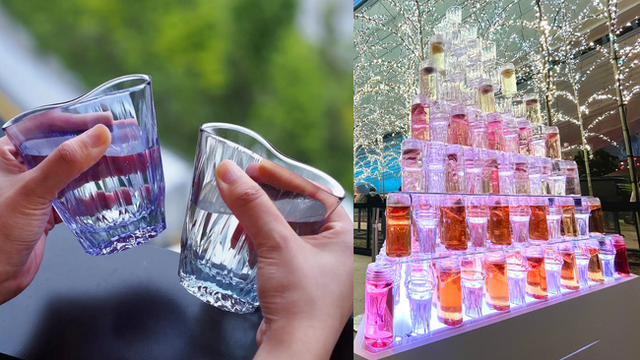 画像の説明:伊藤園が限定発売した、水出しティーバッグ「Ques-tea(クエスティー)」が入ったボトルと、KINJO JAPANのシリコーングラスが交互に並べられ、7段に積み上げられたティータワー。朝と夜、それぞれ異なる光を放ち、輝いた