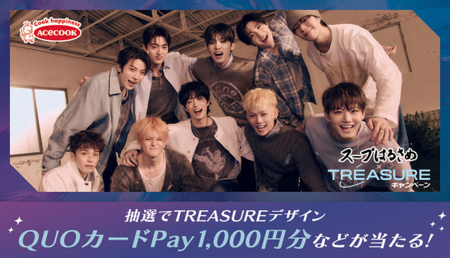 株式会社クオカード(以下当社、本社:東京都中央区、代表取締役社長:近田 剛)が展開するスマートフォンで使えるデジタルギフト「QUOカードPay(クオ・カード ペイ)」は、エースコック株式会社が「TREASURE」とコラボして開催する「スープはるさめ×TREASUREキャンペーン」で採用されました。本キャンペーンでは、期間中に対象商品を3個以上購入したレシートで応募すると、抽選でTREASUREデザインのQUOカードPayなど豪華賞品がプレゼントされます。