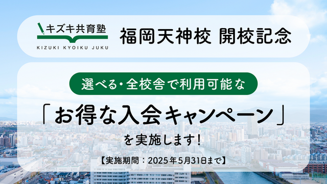 不登校・引きこもり・高校中退などの方の学び直しを完全個別指導でサポートする【キズキ共育塾】が、2025年5月下旬に福岡市中央区にて「福岡天神校」を開校いたします。