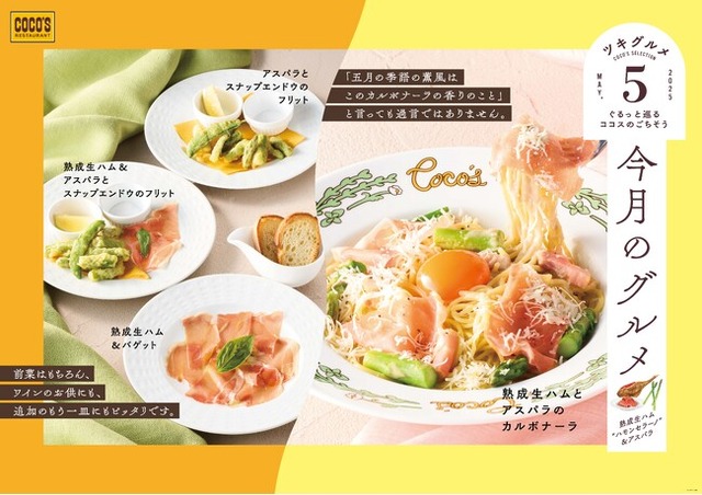 また、「熟成生ハムとアスパラのカルボナーラ」とグリーンサラダ、ドリンクバー、スープバーがセットになったお得な「5月のグルメコース」も販売します。