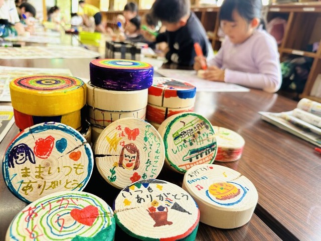 母の日ありがとう風呂は、5月9日から5月18日の期間中、子供たちからのメッセージ付きヒノキ入浴木を女性浴室のお風呂に浮かべるイベントです。イベント開催に先駆け、4月30日に地元ときがわ町の学童保育 ひまわりクラブに玉川温泉スタッフが訪問し、子供たちからの身近な女性に向けたメッセージをヒノキ入浴木に記入していただきます。