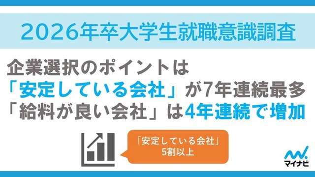 株式会社マイナビ(本社:東京都千代田区、代表取締役 社長執行役員:土屋芳明)は、2026年卒業予定の全国の大学生、大学院生を対象に実施した、「マイナビ 2026年卒大学生就職意識調査」の結果を発表しました。