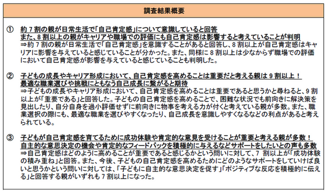 また、子どもの成長やキャリア形成においては、自己肯定感を高めることで、困難な状況でも前向きに解決策を見出したり、自分自身を過小評価せずに前向きに物事を考える力が付くと9割以上の親が回答する結果となりました。