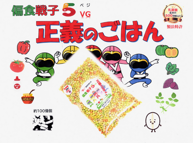 そこで日本人の遺伝体質的に最も適合し消化吸収性にも優れ、ほぼ毎日食べるご飯でバランス良く多種の栄養を美味しく、然も違和感なく食する事が出来れば理想的な偏食防止対策であると考え、5種類の野菜とスーパーフードのモリンガと植物性乳酸菌や蜂蜜やオリゴ糖で加工融合したもち麦(偏食戦子5vg「正義のご飯」)の開発に至りました。