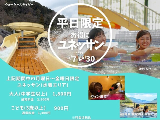 箱根小涌園ユネッサン(所在地:神奈川県足柄下郡箱根町ニノ平1297、支配人:松山 元信 以下:ユネッサン)では、2025年5月7日(水)~2025年6月30日(月)の間、今年も平日限定企画として、 水着で遊べる温泉「ユネッサン」の入場料がお得になるキャンペーンを実施いたします。