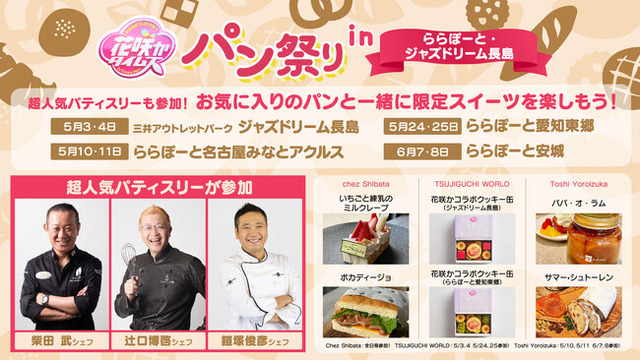 三井不動産商業マネジメント株式会社(本社:東京都中央区、代表取締役社長:大林 修)が運営する三井アウトレットパーク ジャズドリーム長島、三井ショッピングパーク ららぽーと名古屋みなとアクルス、ららぽーと愛知東郷、ららぽーと安城(4月18日グランドオープン)の4施設では、株式会社CBCテレビ(本社:愛知県名古屋市、代表取締役社長:松波 啓三)の人気番組「なるほどプレゼンター!花咲かタイムズ」とタイアップした『花咲かタイムズパン祭りinららぽーと・ジャズドリーム長島』を開催いたします。