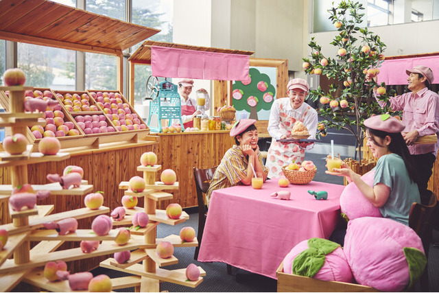 会場は、桃の木のモチーフや収穫用の木箱などが置かれ、桃の果樹園をイメージした空間です。大きな木箱に桃の実がいっぱいに入った「ももボールプール」では、まるで自分が収穫されたかのような写真が撮影できます。他にも、桃を木箱に投げ入ると景品がもらえる「もも収穫ゲーム」などのミニゲームもあり、お腹だけではなく、目も心も桃で満たされます。