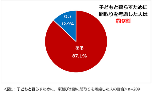 現在の住まいに入居する際に子どもがいたと回答した209名に、「子どもと暮らすために、家選びの際に間取りで考慮したことはありますか?」と尋ねたところ、約9割の人が間取りを考慮したことが分かりました。(図1)