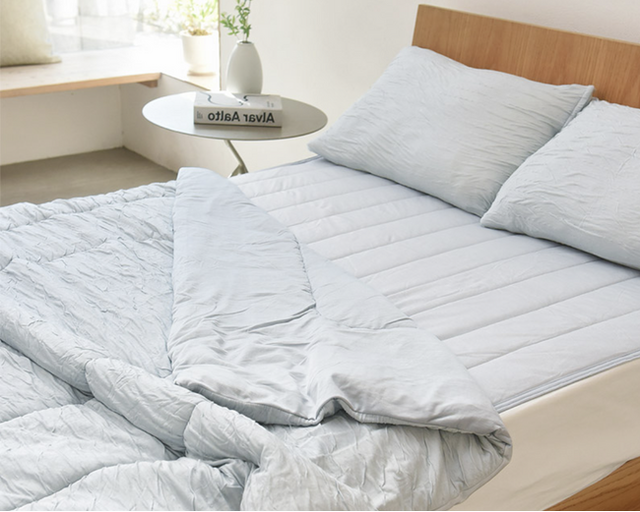 「呼吸する寝具」シリーズは、組み合わせて使える全3アイテムで登場!敷きパッド、リバーシブル肌掛けケット、くしゅくしゅ枕カバー。