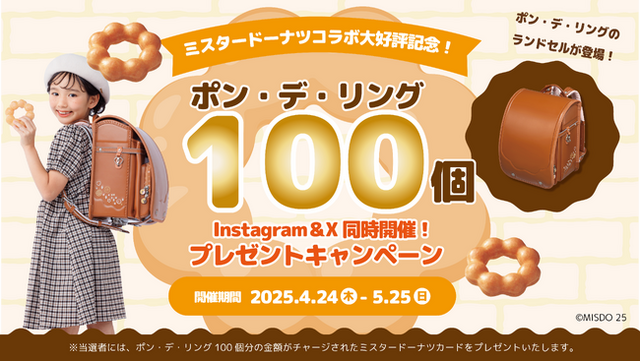 この度、大好評特別企画として、ランドセルのモチーフになったポン・デ・リング100個※2をプレゼントするキャンペーンを4月24日(木)より開催します。