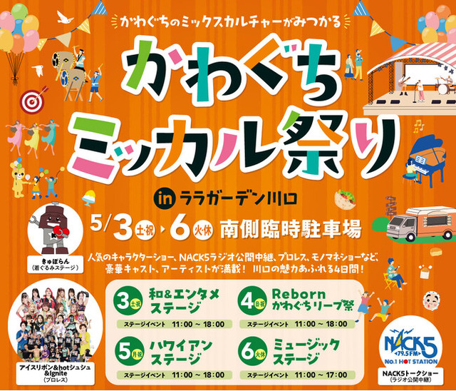 三井ショッピングパーク ララガーデン川口(運営:三井不動産商業マネジメント株式会社)は、5月3日(土・祝)から6日(火・休)の4日間、かわぐちのミックスカルチャーがみつかる「かわぐち”ミッカル”祭り」を開催!