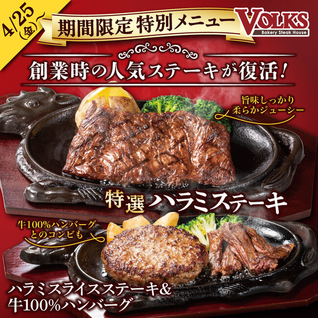 株式会社アークミール(本社:埼玉県さいたま市、代表取締役社長:柳 先)が運営する『フォルクス』では、2025年4月25日(金)から全38店舗で創業時にリーズナブルな価格と、柔らかくジューシーな味覚で人気を博した特選ハラミステーキを期間限定でGW期間中に販売いたします。