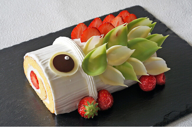 お子様の健やかな成長を願うこいのぼりを模したケーキは苺を丸々サンドしたロールケーキに、生クリームと白、緑のチョコレートと苺でカラフルにかわいらしく飾り付け、こどもの日にぴったりなケーキに仕上げました。
