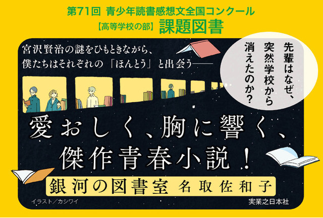 名取佐和子さんの青春小説『銀河の図書室』が、第71回「青少年読書感想文全国コンクール」【高等学校の部】(主催/全国学校図書館協議会・毎日新聞社)の課題図書に選出されました。本作は、高校の図書室を舞台に、宮沢賢治の言葉を残して突然学校から消えた先輩の謎を追う高校生たちを、瑞々しい筆致で描く長編小説です。