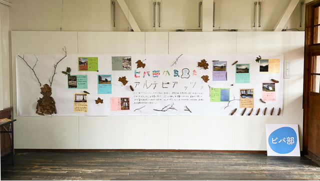 小学校の廃校を活用した美術館に何度も足を運び、写真と自分たちの言葉でアルテピアッツァの魅力を綴りました。選んだ写真には、落ち葉や木の枝など、美術館の敷地にある素材をあしらい、子どもたち目線で「アルテピアッツァ美唄の美しさ」を表現しています。