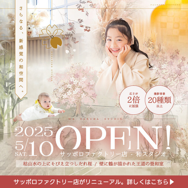 この度、札幌にあるフォトスタジオ写真工房ぱれっとサッポロファクトリー店(本社/有限会社三景スタジオ)の人気No.1であった和モダンスタジオがリニューアルオープンいたします。
