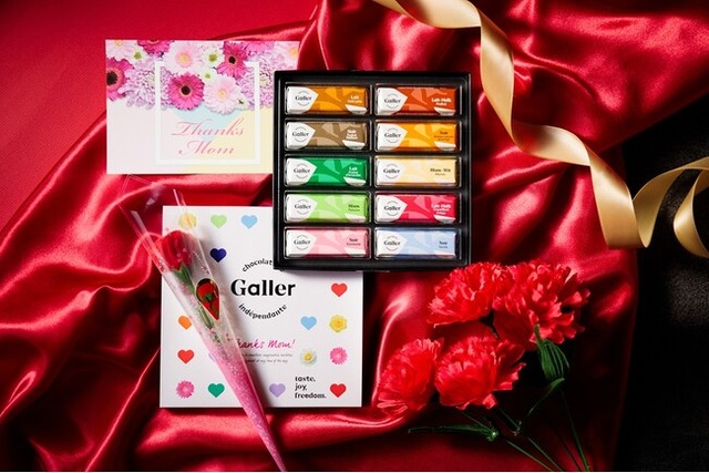 ベルギー王室御用達「Galler」の人気チョコレートを、鮮やかなお花デザインの母の日用スリーブに入れた特別なセット。カーネーションとメッセージカードを添えた仕様で、開けた瞬間のときめきも演出します。