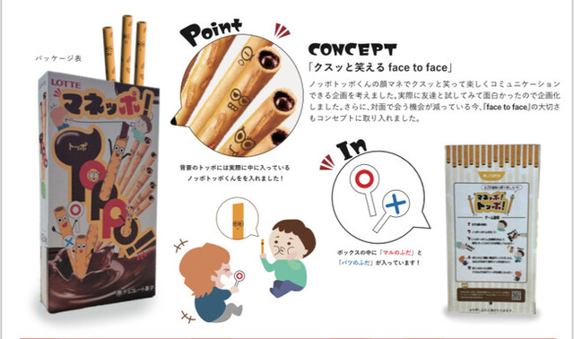 学生たちが提案したのは、表情まねっこゲームが楽しめる『#マネッポ!トッポ!』。トッポに描かれたキャラクター「ノッポトッポくん」の表情を真似して、お互いにジャッジしながら笑い合う、新感覚の“コミュニケーション菓子”です。親子やカップル、友達同士など様々なシーンで楽しめる工夫が詰まっており、「お菓子を通じて笑顔を共有する」というテーマを学生ならではの視点で形にしました。