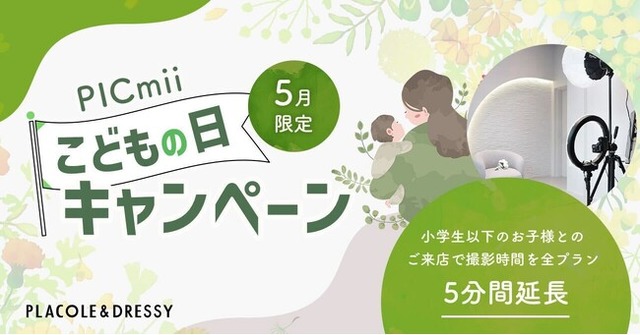 セルフ写真館 PICmiiは、カメラ専門店「カメラのキタムラ」のグループ会社として、撮影画質の仕上がりにこだわったセルフ写真館で、個室での自由な撮影をお楽しみいただけます。DRESSY ROOM YOKOHAMA/NAGOYAスタジオでは、5月限定で『こどもの日キャンペーン』を実施。 5月5日はこどもの日です。 健やかな成長を願い、小学生以下のお子様と一緒にご来店いただいた方は、撮影時間をプランより5分間延長にてご案内させていただきます。(記事または、プレスリリースを見た旨をお伝え下さい。)