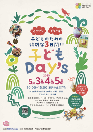 町田薬師池公園四季彩の杜 西園(指定管理者NEST Machida)では、ゴールデンウィークの内3日間、5月3日(土)、4日(日)、5日(月祝)に子どものためのイベント「子どもDay's」を開催します。