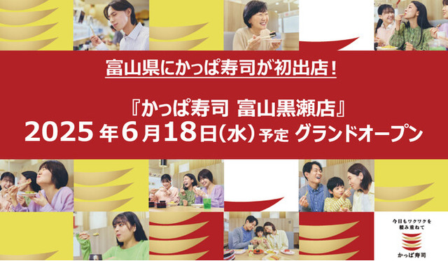 コロワイドグループのかっぱ寿司(カッパ・クリエイト(株) 本社:神奈川県横浜市、代表取締役社長:山角豪)は、2025年6月18日(水)《予定》 に『かっぱ寿司 富山黒瀬店』をオープンいたします。