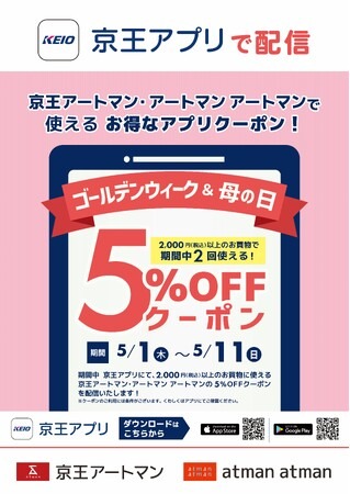 京王アートマン・アートマン アートマン全店舗にて「京王アプリ限定 ゴールデンウィーク&母の日5%OFFクーポン」を開催いたします。
